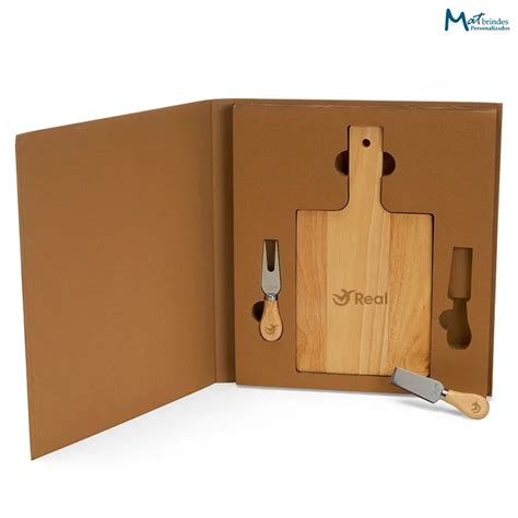 O kit queijo personalizado conta com duas facas, um garfo, uma espátula, tábua e suporte para acomodar todas as peças, e vem embalado em caixa de papel kraft. Personalize o conjunto para queijo com sua marca a laser e compre a partir de 50 unidades.